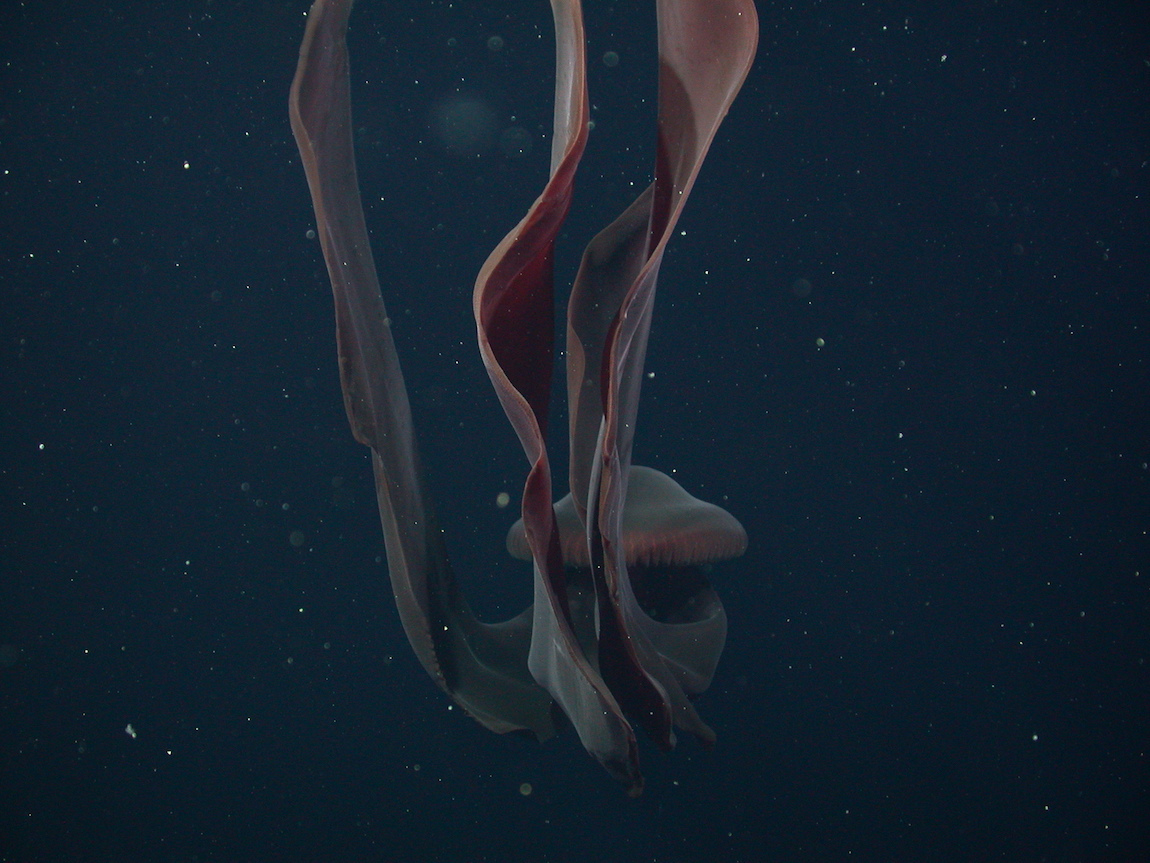 The Phantom Jellyfish occupies a unique position in the deep-sea ecosystem. ROV footage reveals that multiple deep-sea organisms have formed symbiotic relationships with it: a specialized species of deep-sea juvenile fish takes refuge in the safe area beneath its bell to evade predators; certain amphipod crustaceans attach to its oral arms, feeding on organic particles collected by the jellyfish. This jellyfish is likely a “mobile oasis” in the abyss, providing shelter and food for countless small organisms and serving as a crucial node in the abyssal food web.